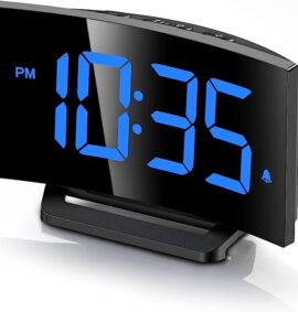 Digital Alarm Clock for Bedrooms, Digital Clock with Modern Curved Design, Conspicuous Blue LED Numbers, 6 Levels Brightness, 2 Volume, 3 Alarm Tones, Snooze, Power-Off Memory, 12/24H, Bedside Clock